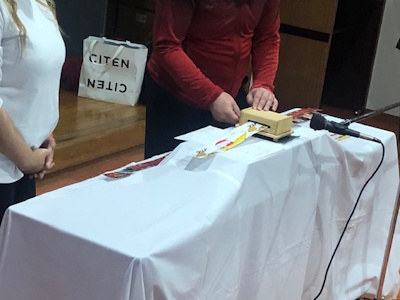 木原館長がサンタ帽子をかぶって登場しました。