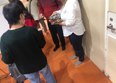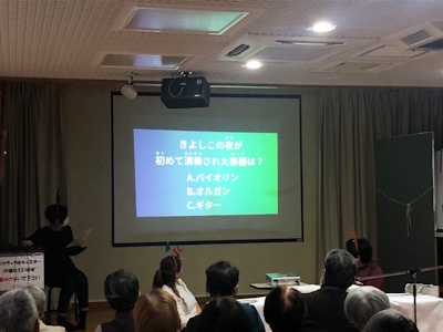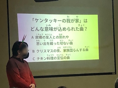 「ケンタッキーの我が家」についてのクイズに、「チキン料理の宣伝かい!!!(笑)」と利用者さんから鋭いツッコミが入り、皆さん大爆笑されていました。